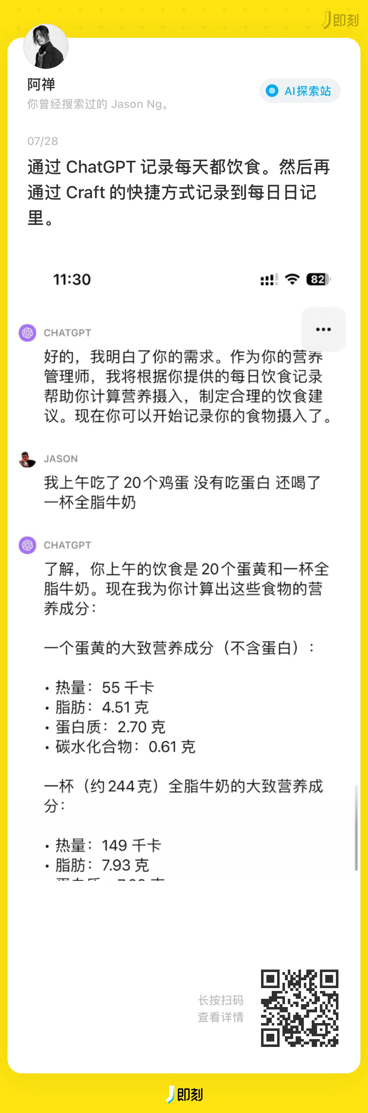 最近我看到有人使用 AI 工具记录热量,试用了下,效果非常好,非常方便,基本解决我上述提到的两个问题。